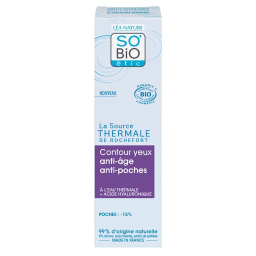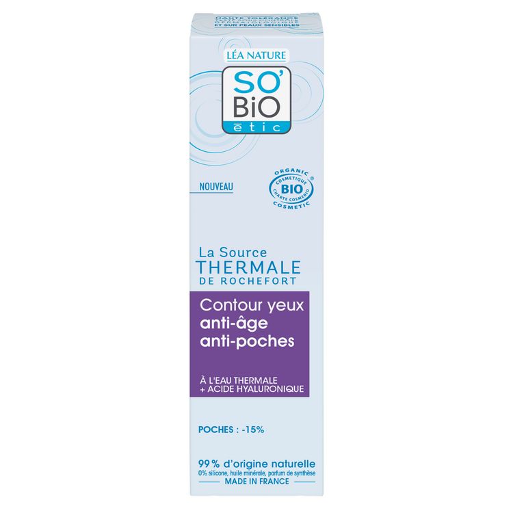 Ce Contour yeux à la texture fondante associe l'Eau thermale de Rochefort à un extrait d'Iris bio anti-oxydant issu d'un procédé breveté et à l'Acide hyaluronique repulpant, pour agir sur les signes de l'âge. Enrichi en actif fermeté, il diminue les poches et hydrate le contour des yeux pour un regard plus reposé. Formulé avec de l'Eau thermale de Rochefort, station thermale agréée pour la dermatologie, aux vertus ressourçantes, apaisantes et fortifiantes. RÉSULTATS PROUVÉS -15% Poches¹ 96% Peaux hydratée² 1. Auto évaluation 10 femmes - 28 jours. 2. % de satisfaction - 37 femmes - 56 jours. HAUTE TOLÉRANCE . TESTÉ SOUS CONTRÔLE DERMATOLOGIQUE ET SUR PEAUX SENSIBLES. COSMOS ORGANIC certifié par ECOCERT Greenlife. 99% d'origine naturelle. 0% silicone, huile minérale et parfum de synthèse. + ÉTHIQUE : - Filière France : SO'BIO étic a sélectionné l'Eau thermale de Rochefort, en Charente-Maritime là où est fabriqué ce produit, dans une démarche de production locale. - Tube végétal - Fabriqué en France - 1% for the planet