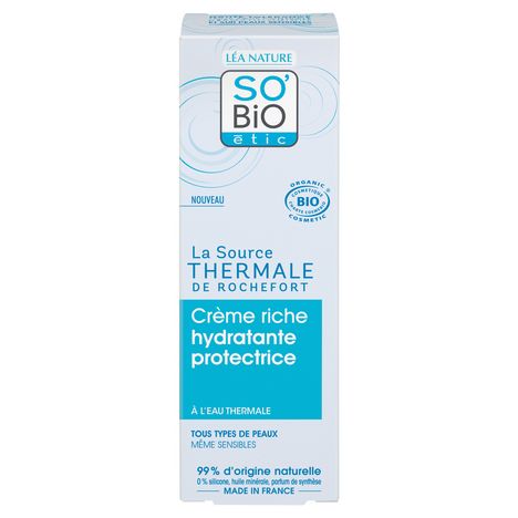 Ce Soin frais et généreux associe l'Eau thermale de Rochefort à un extrait de Nymphéa bio hydratant¹ issu d'un procédé breveté, pour ressourcer la peau. Rechargée durablement en eau, elle est confortable et protégée des agressions quotidiennes² et du dessèchement. Le teint est éclatant de fraîcheur. Formulée avec de l'Eau thermale de Rochefort, station thermale agréée pour la dermatologie, aux vertus ressourçantes, apaisantes et fortifiantes. 1. Hydratation des couches supérieures de l'épiderme. 2. Des agressions extérieures. RÉSULTATS PROUVÉS³ - 100% HYDRATE PENDANT 24 H - 100% RAFRAÎCHIT LE TEINT - 100% PROTÈGE DU DÉSSÈCHEMENT 3. % de satisfaction 23 femmes- 21 jours. HAUTE TOLÉRANCE . TESTÉ SOUS CONTRÔLE DERMATOLOGIQUE ET SUR PEAUX SENSIBLES. COSMOS ORGANIC certifié par ECOCERT Greenlife. 99% d'origine naturelle. 0% silicone, huile minérale et parfum de synthèse. + ÉTHIQUE : - Filière France : SO'BIO étic a sélectionné l'Eau thermale de Rochefort, en Charente-Maritime là où est fabriqué ce produit, dans une démarche de production locale. - Tube végétal - Fabriqué en France - 1% for the planet