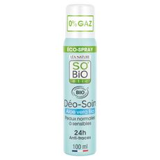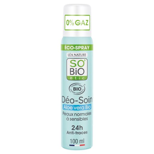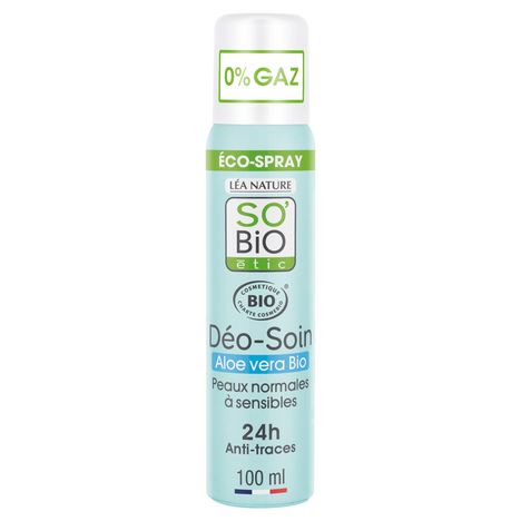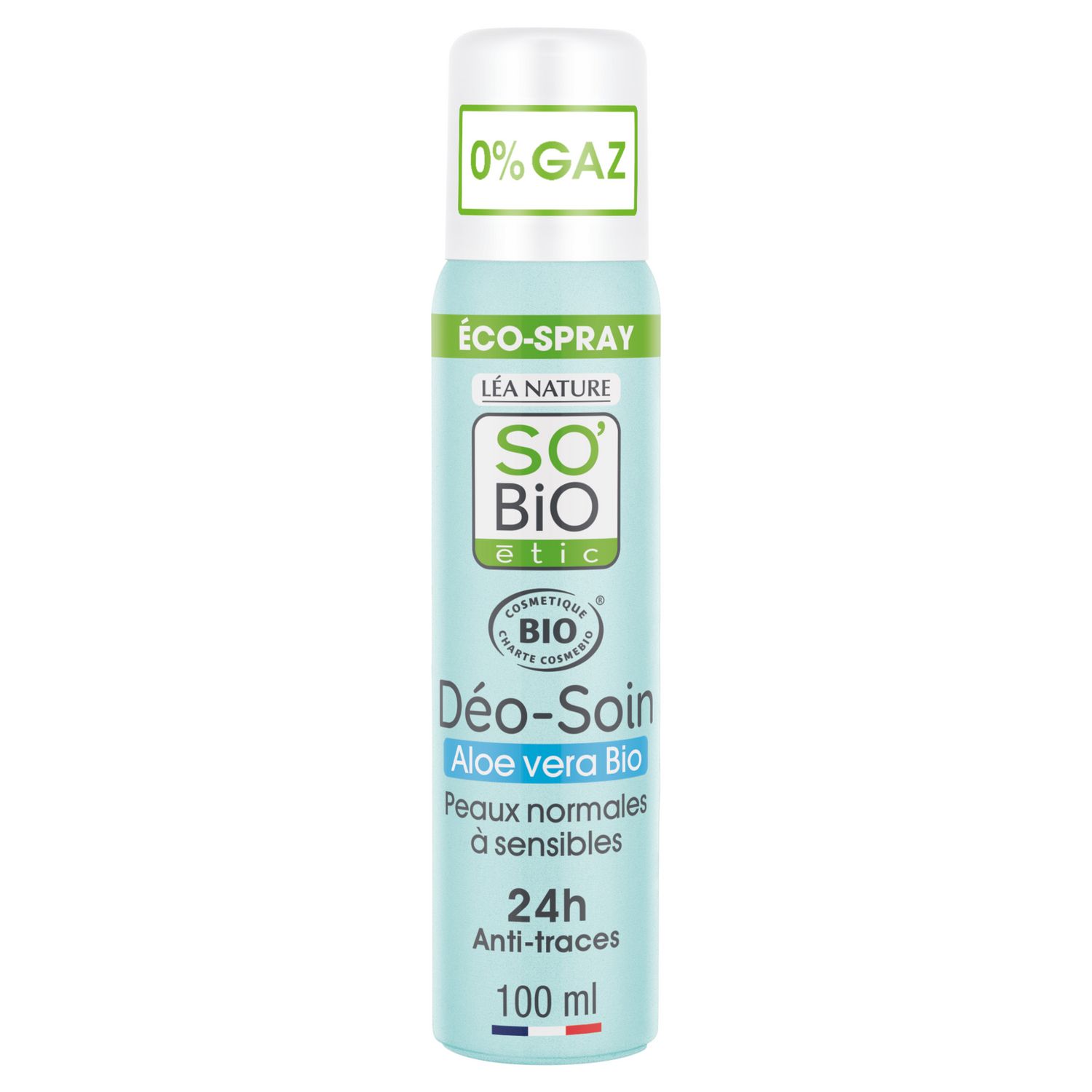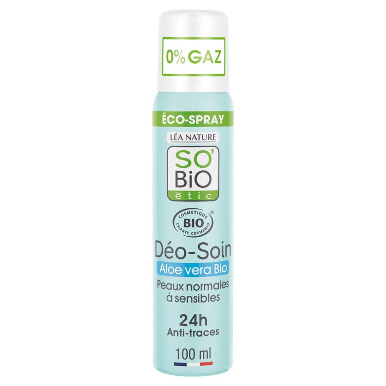 Sans gaz pétrochimique ni alcool, le déo-soin éco-spray SO'BiO étic® à l’Aloe vera bio, actif d’origine végétale reconnu pour ses propriétés hydratantes1, garantit une efficacité 24h