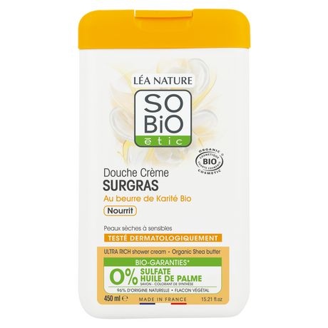 La crème de douche SURGRAS au beurre de Karité biologique SO' BiO étic® nourrit les peaux sèches même les plus sensibles grâce à sa formule SANS SULFATES*. Douche crème surgras, à l'huile de karité, nourrit