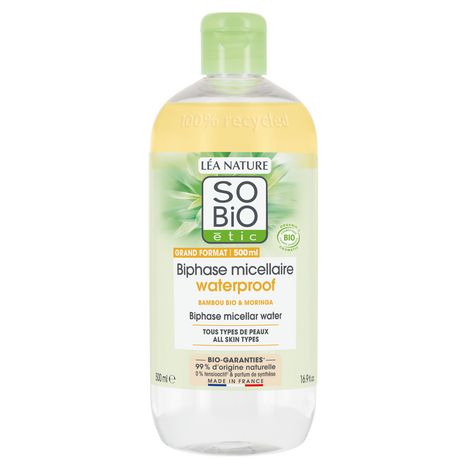 Biphase micellaire waterproof, tous types de peaux, Grand Format 500ml SO'BiO étic