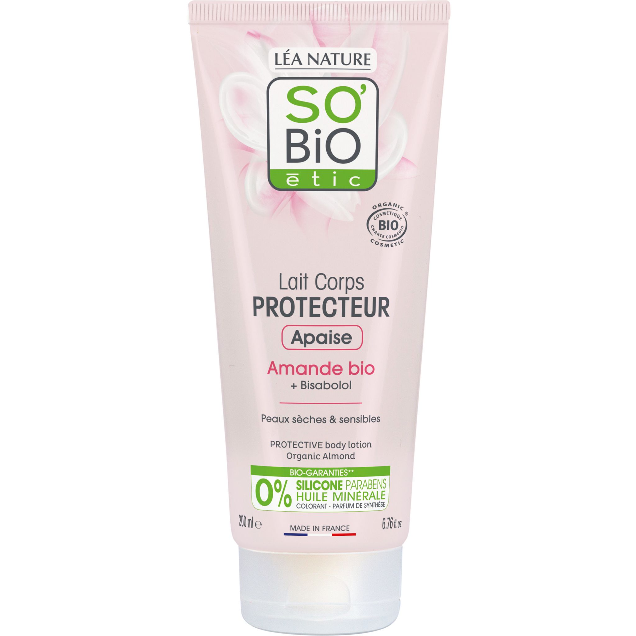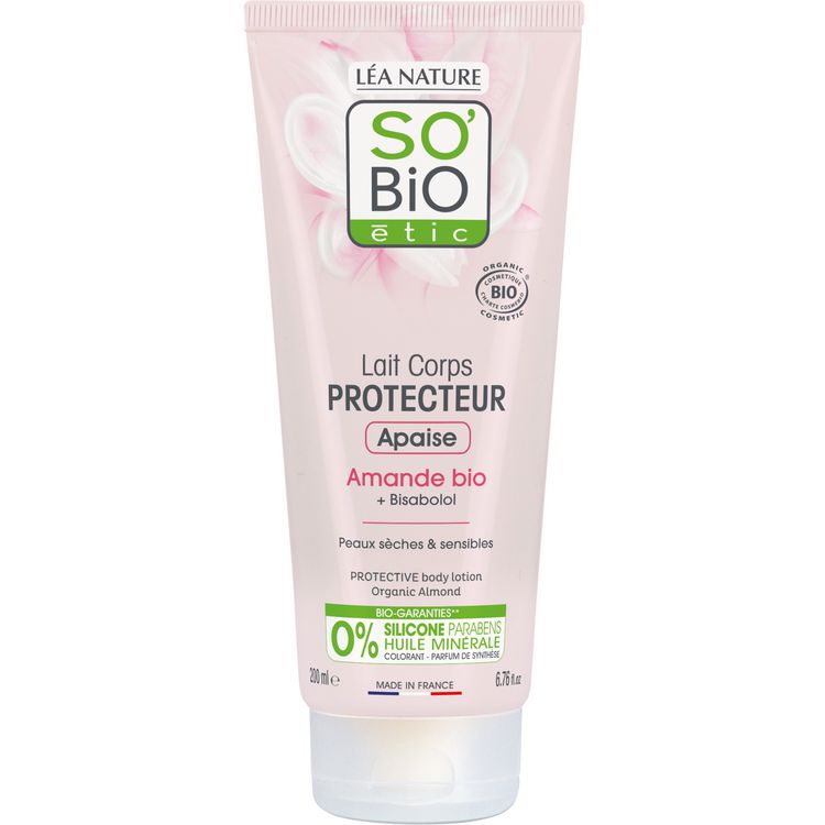 Le Lait Corps PROTECTEUR, formulé avec de l'huile d'Amande douce bio et du bisabolol, apaise les peaux sèches même les plus sensibles.