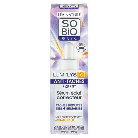 RÉSULTATS PROUVÉS SUR LES TACHES Dès 2 semaines : Peau lumineuse et le teint unifié Dès 4 semaines : taches visblement réduites. En 8 semaines : TACHES MOINS VISIBLES pour 90% des femmes(1) 1. % satisfaction 21 femmes TESTÉ SOUS CONTRÔLE DERMATOLOGIQUE COSMOS ORGANIC certifié par ECOCERT Greenlife. 99% d'origine naturelle. 0% silicone, huile minérale et parfum de synthèse. + ÉTHIQUE : - Filière bio France : Bulbes de Lys sélectionnés sont bio, français et issus d'une exploitation familiale. Leur achat participe au soutien d'un producteur local. - Flacon 100% Verre - Fabriqué en France - 1% for the planet