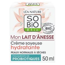 Retrouvez un teint éclatant de santé avec la Crème Soyeuse hydratante de Mon Lait d'Ânesse. Grâce à une alliance d'actifs unique, le microbiome de la peau est respecté et équilibré. La barrière cutanée est renforcée, la peau protégée et apaisée. Jour après jour, l'état de la peau s'améliore, elle retrouve douceur et souplesse. Formulé avec : - Lait d'Anesse bio hydratant - Huile d'Abricot bio revitalisante - Fragments de probiotiques, préservant l'équilibre et la diversité du microbiome, naturellement présents dans le lait d'anesse. RÉSULTATS PROUVÉS [100 %] Peau HYDRATÉE¹ [+30%] Peau DOUCE² [-50 % ] TIRAILLEMENTS² 1. % satisfaction - 21 femmes - dès la 1ère application. 2. Test clinique mesuré - 21 femmes dont 50% peau sensible - 28 jours RÉSULTATS PROUVÉS [100 %] Peau HYDRATÉE¹ [+30%] Peau DOUCE² [-50 % ] TIRAILLEMENTS² 1. % satisfaction - 21 femmes - dès la 1ère application. 2. Test clinique mesuré - 21 femmes dont 50% peau sensible - 28 jours COSMOS ORGANIC, certifié par ECOCERT Greenlife 99% d'origine naturelle. 21% du total des ingrédients sont issus de l'agriculture biologique. Le 1% restant sert à la bonne stabilité du produit Testé sous contrôle dermatologique. + ETHIQUE : - Filière BIO France : SO'BiO étic® sélectionne du lait d'Ânesse provenant exclusivement d'asineries artisanales biologiques françaises. La collecte du lait à des fins cosmétiques ne prive pas les ânons du lait de leur mère - Pot 100% verre - Fabriqué en France - 1% for the planet