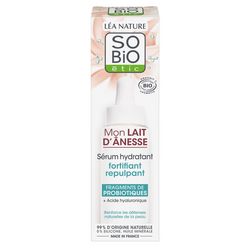 Retrouvez un teint éclatant de santé grâce à ce Sérum hydratant fortifiant repulpant Mon Lait d'Anesse. Grâce à une alliance d'actifs unique, le microbiome de la peau est respecté et équilibré. Jour après jour, la barrière cutanée est renforcée, la peau est moins sensible et intensément réhydratée. Formule hautement concentrée à l'efficacité boostée grâce à : - 2X plus¹ de lait d'Anesse bio hydratant - de l'Acide Hyaluronique repulpant - 5X plus¹ de fragments de probiotiques, préservant l'équilibre et la diversité du microbiome, naturellement présnet dans le lait d'Anesse. 1. Par rapport aux crèmes jour de la même gamme RESULTATS PROUVES Immédiatement : peau repulpée, hydratée, apaisée Dès 28j: plus forte face aux agressions extérieures, la peau est plus belle, plus lisse, plus lumineuse. [+29%] PEAU REGENEREE² [-68%] TIRAILLEMENTS² 2. Test clinique mesuré - 21 femmes dont 50% peau sensible RESULTATS PROUVES Immédiatement : peau repulpée, hydratée, apaisée Dès 28 j:plus forte face aux agressions extérieures, la peau est plus belle, plus lisse, plus lumineuse. [+29%] PEAU REGENEREE² [-68%] TIRAILLEMENTS² 2. Test clinique mesuré COSMOS ORGANIC, certifié par ECOCERT Greenlife 0% silicone, huile minérale 99% d'origine naturelle + ETHIQUE - SO BiO étic® sélectionne du lait d'Ânesse provenant exclusivement d'asineries artisanales biologiques françaises. La collecte du lait à des fins cosmétiques ne prive pas les ânons du lait de leur mère. - Flacon 100% verre recyclable - Fabriqué en France - 1% FOR THE PLANET Member