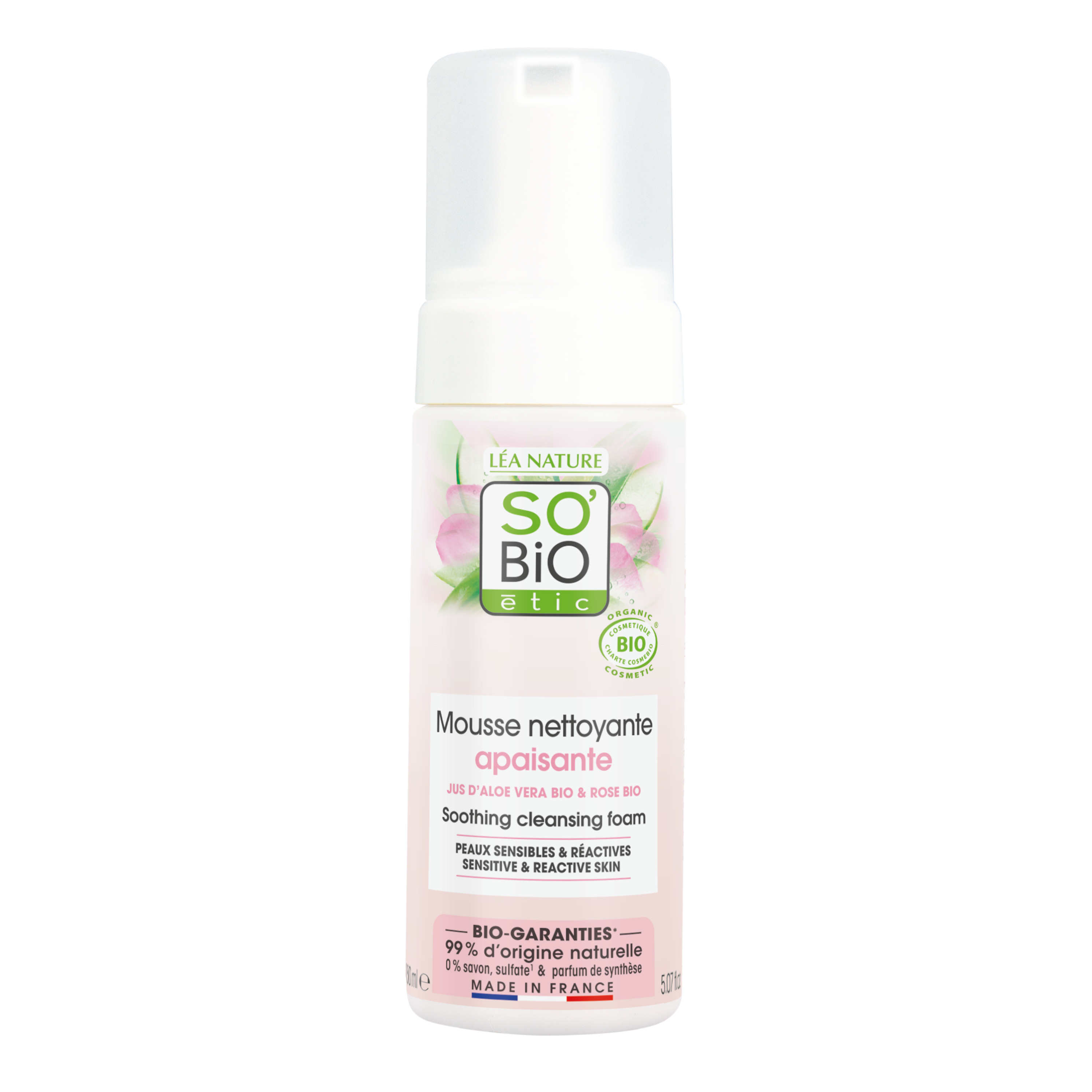 Mousse nettoyante apaisante bio jus d'aloe vera et rose peaux sensibles et réactives