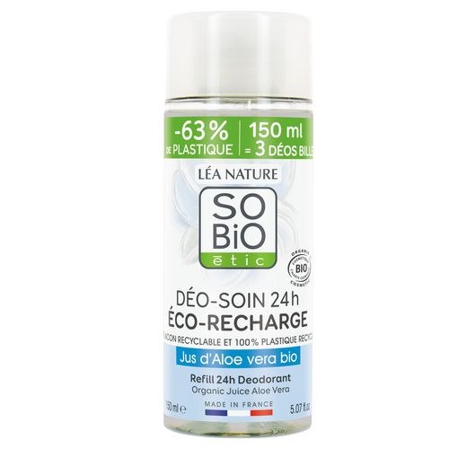 Recharge déo-bille déo-soin Aloe vera bio Efficacité 24h Anti-traces SO'BiO étic Flacon recyclable