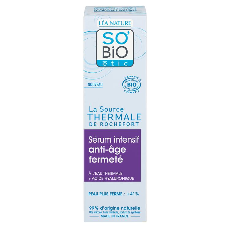 Ce Sérum associe l'Eau Thermale de Rochefort à un extrait d'Iris bio anti-oxydant issu d'un procédé breveté et à de l'Acide hyaluronique. Concentré en actifs, il possède une action anti-âge renforcée qui repulpe la peau lui donne un éclat immédiat, aide à prévenir et corriger les rides et lutte contre la perte de fermeté. La peau paraît plus jeune Formulé avec de l'Eau thermale de Rochefort, station thermale agréée pour la dermatologie, aux vertus ressourçantes, apaisantes et fortifiantes RÉSULTATS PROUVÉS 76% Prévient et réduit les rides² 41% Raffermit la peau³ 51% Repulpe la peau³ 2.% de satisfaction 21 femmes-28 jours. 3. Auto-évaluation 21 femmes - 28 jours. RÉSULTATS PROUVÉS - 76% Prévient et réduit les rides² - 41% Raffermit la peau³ - 51% Repulpe la peau³ 2.% de satisfaction 21 femmes-28 jours. 3. Auto-évaluation 21 femmes - 28 jours. HAUTE TOLÉRANCE . TESTÉ SOUS CONTRÔLE DERMATOLOGIQUE ET SUR PEAUX SENSIBLES. COSMOS ORGANIC certifié par ECOCERT Greenlife. 99% d'origine naturelle. 0% silicone, huile minérale et parfum de synthèse. + ÉTHIQUE : - Filière bio France : SO'BIO étic a sélectionné l'Eau thermale de Rochefort, en Charente-Maritime là où est fabriqué ce produit, dans une démarche de production locale. - Eco conception - Fabriqué en France - 1% for the planet