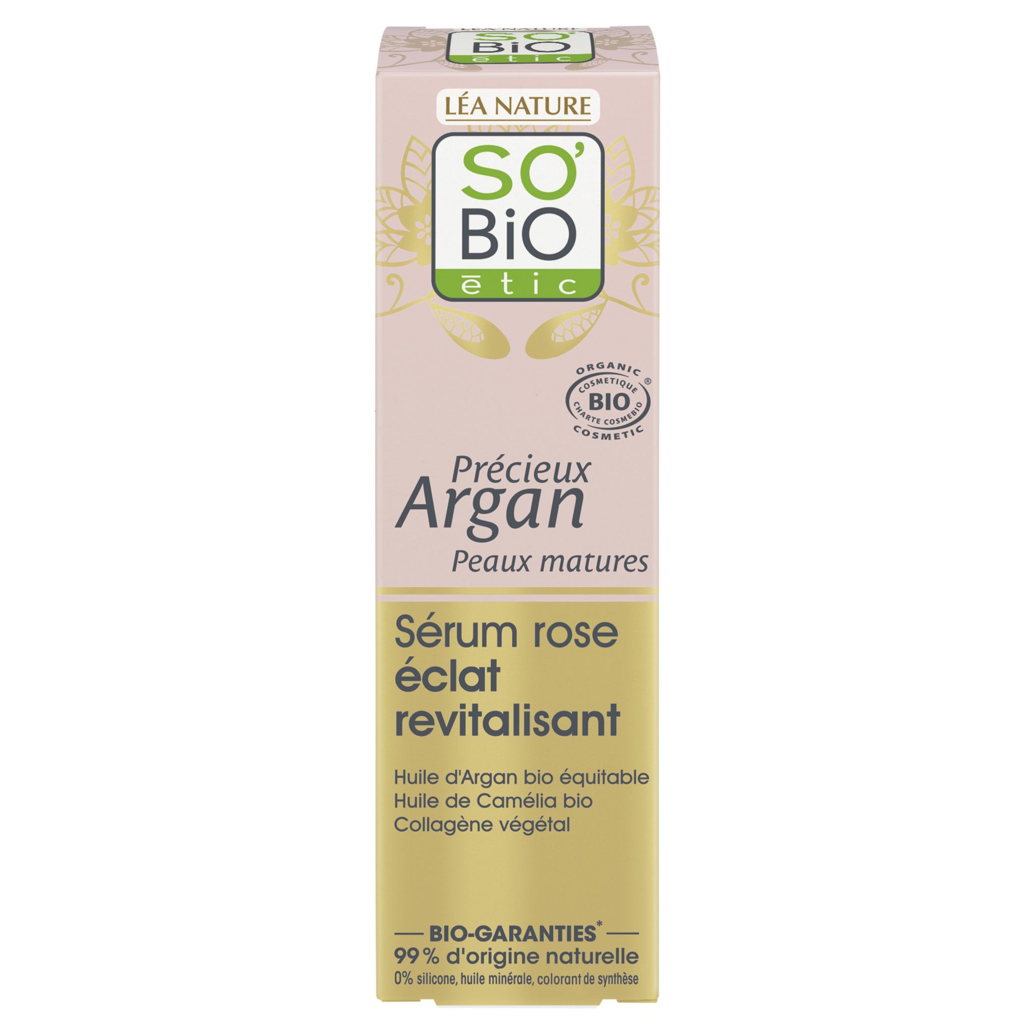 SO'BiO étic® crée la gamme Précieux Argan PEAUX MATURES pour répondre aux exigences de confort, de densité et de vitalité des peaux fragilisées et affinées par l'âge. Une association unique d'actifs reconnus pour leur richesse naturelle : l'huile d'Argan bio équitable nourrissante, associée à l'huile de Camélia bio restructurante1 et au Collagène végétal redensifiant1. 1. Reconnus pour leurs propriétés. Ce Sérum rose nacré enrichi en micro-perles d'huiles aux propriétés raffermissantes et restructurantes redonne fermeté et vitalité aux peaux matures. Sa texture perlée fluide, fondante et hautement sensorielle apporte du confort à la peau. Elle retrouve un éclat naturel et subtil grâce aux nacres minérales d'origine naturelle. SO'BiO étic® a sélectionné une huile d'Argan biologique et labélisée équitable issue du Maroc, dans son terroir originel. Son achat garantit une juste rétribution des travailleurs et contribue à l'amélioration de leurs conditions de vie.