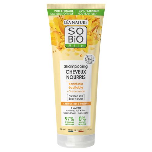Le shampooing Cheveux Nourris SO BiO étic, destiné à aux cheveux secs à très secs, combine le beurre de Karité bio équitable et la cire de Jojoba, des actifs riches en oméga 9 pour renforcer les cheveux jusqu'aux pointes. Formulé sans sulfate et sans silicone afin de respecter vos cheveux. Résultat : Intensément nourris, vos cheveux sont brillants, renforcés jusqu'aux pointes ! -Cheveux sains en 3 shampooings -Cheveux nourris : 76% -Cheveux brillants : 70% % de satisfaction, obtenu après 5 utilisations. Panel réalisé sur 74 femmes. COSMOS ORGANIC certifié par ECOCERT Greenlife 97% d'origine naturelle 0% sulfate*, silicone *sans tensioactifs sulfatés +ETHIQUE : - Filière bio équitable - Nouveau tube végétal (hors capsule) : 35 % de plastique en moins vs le tube 250 ml précédent - Fabriqué en France - 1% for the planet