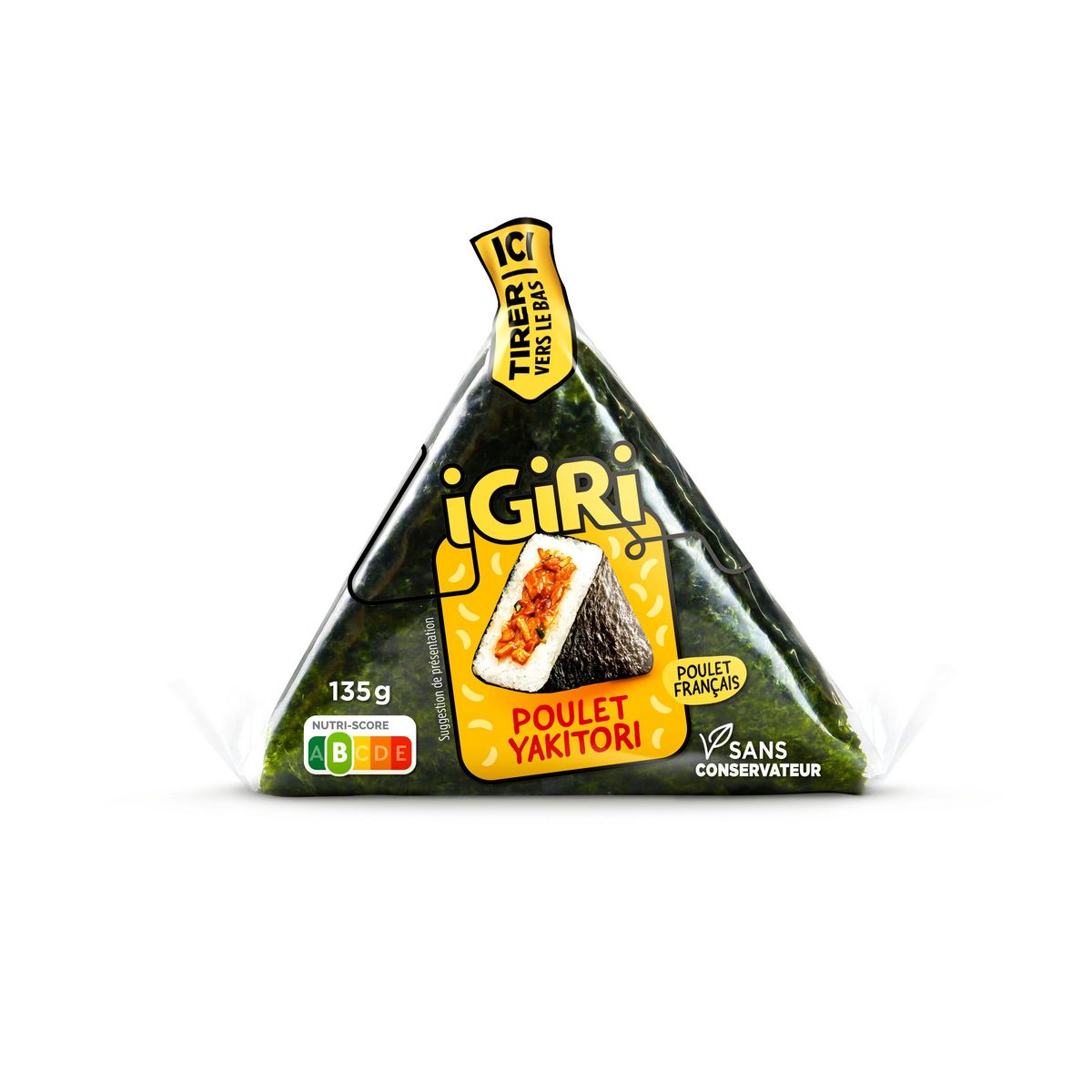 Riz cuit 69% (eau, riz), sauce au vinaigre de riz (vinaigre de riz 8%, sucre, sel), viande de poulet rôti traitée en salaison 8.9% (viande de poulet origine France, eau, dextrose, fécule de pomme de terre, sucre roux, arôme naturel, sel), sauce yakitori 5.9% [sauce soja (eau, graines de soja , blé , sel, sucre, extrait de levure), eau, sucre, mélasse de canne, amidon de riz, vinaigre d’alcool, extrait de levure, ail, arôme naturel, gingembre], algue nori 1.2%, ciboule, huile de colza. (% exprimés sur le produit fini)