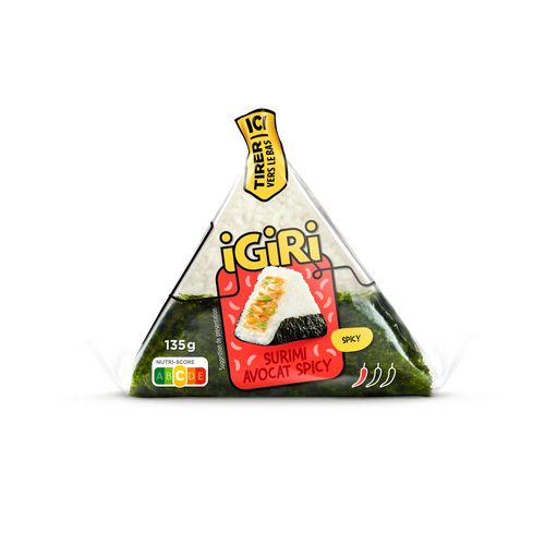Riz cuit 69% (eau, riz), sauce au vinaigre de riz (vinaigre de riz 8%, sucre, sel), mayonnaise [huile de colza, eau, jaune d' œuf , moutarde (eau, graines de moutarde , vinaigre d'alcool, sel), vinaigre d'alcool, sel], surimi de chair de poisson 5.9% [eau, chair de poissons 2,2%, amidons (contient blé ), huile de colza, sucre, sel, arôme naturel (contient crustacés ), colorant : extrait de paprika], avocat 4.1% (avocat, sel, antioxydant : acide ascorbique, acidifiant : acide citrique), huile de colza, algue nori 0,6%, épices, poudre de tomate, sel, piment. (% exprimés sur le produit fini)
