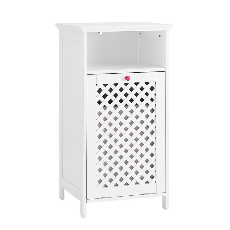 Cette armoire peu encombrante (45x41,5x87 cm) offre une solution de rangement ingénieuse. Il faut que vous sachiez qu'elle combine une étagère ouverte, parfaite pour les serviettes ou les produits d'entretien, avec un panier à linge en tissu durable. Ainsi, vous gardez le linge sale organisé tout en ayant vos essentiels à portée de main.