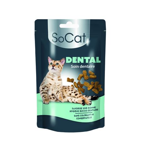 SoCat Dental est une délicieuse friandise spécialement formulée pour favoriser l’hygiène bucco-dentaire de votre chat. Sa forme de petite dent et sa texture aident à nettoyer les dents et lutter contre la formation de tartre et de la plaque dentaire.