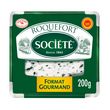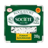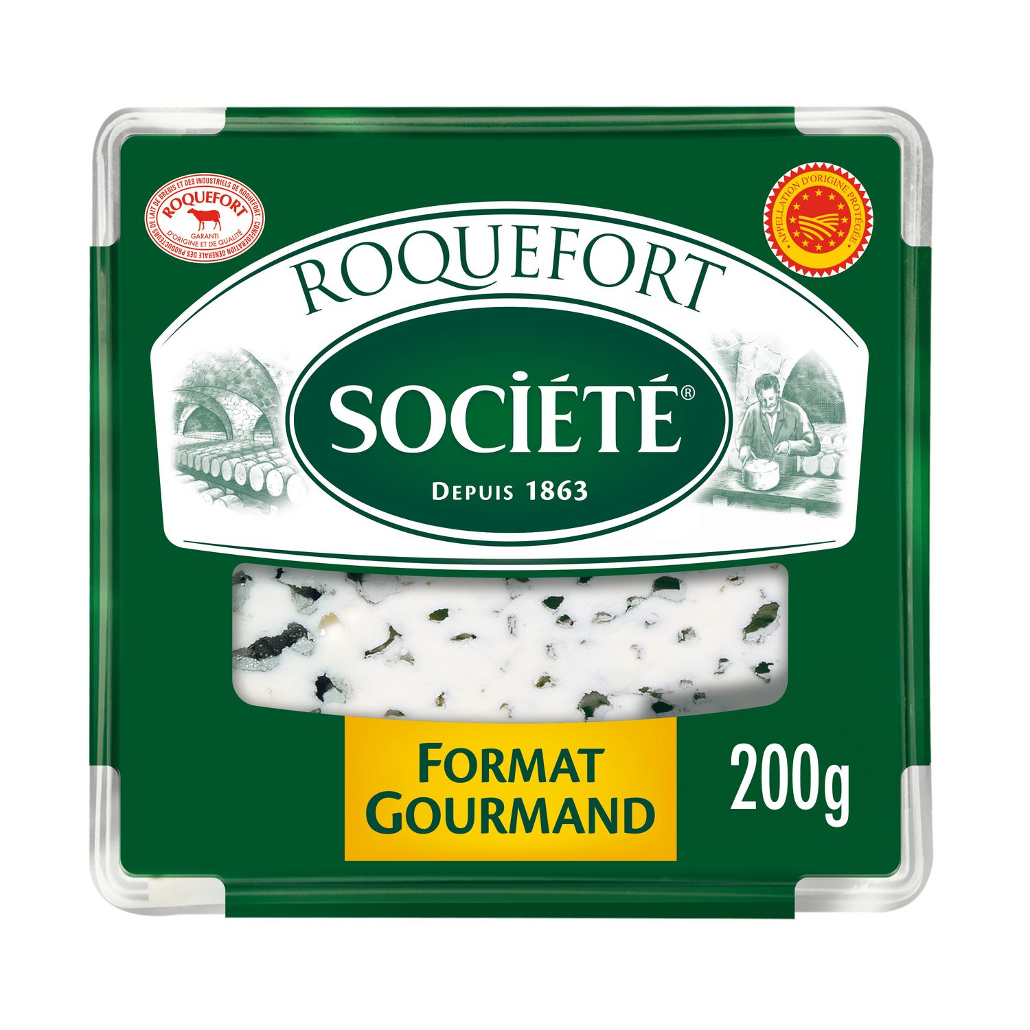 Le Roquefort AOP Société est fabriqué avec du lait cru de brebis collecté auprès de fermes locales d'Aveyron et de 5 départements limitrophes. Les brebis sont élevées en pleine nature (dès que la météo le permet) et nourries sans OGM (<0.9%), principalement d'herbe, de fourrage et de céréales issues de la ferme. Le lait collecté est ensuite livré à nos 2 fromageries aveyronnaises. Puis le Roquefort est affiné dans nos caves naturelles, construites dans la falaise du village de Roquefort-sur-Soulzon en Aveyron (conformément à la réglementation). Nos caves se visitent toute l'année.