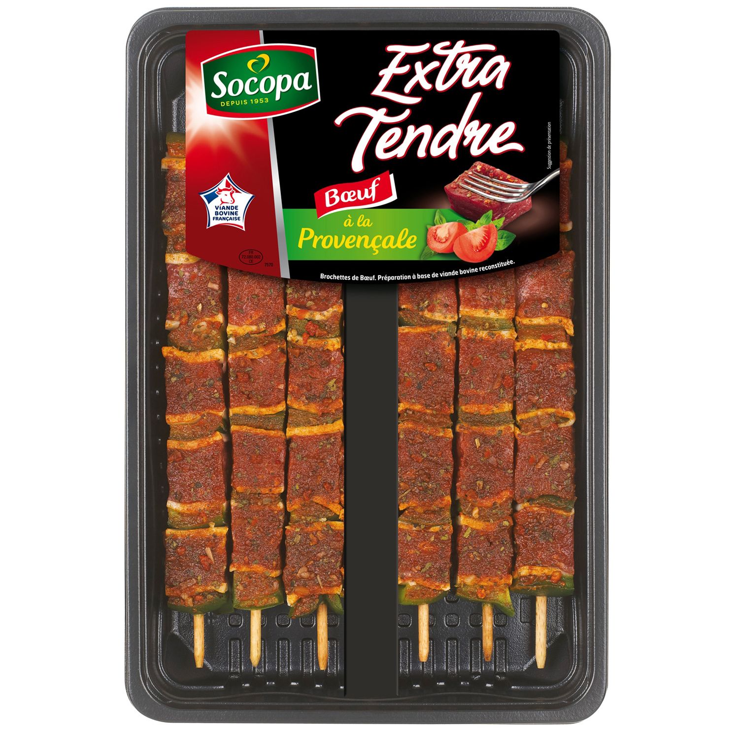 Brochettes de préparation de viande bovine reconstituée, assaisonnées.