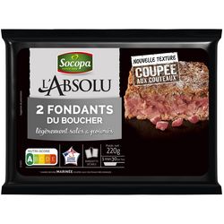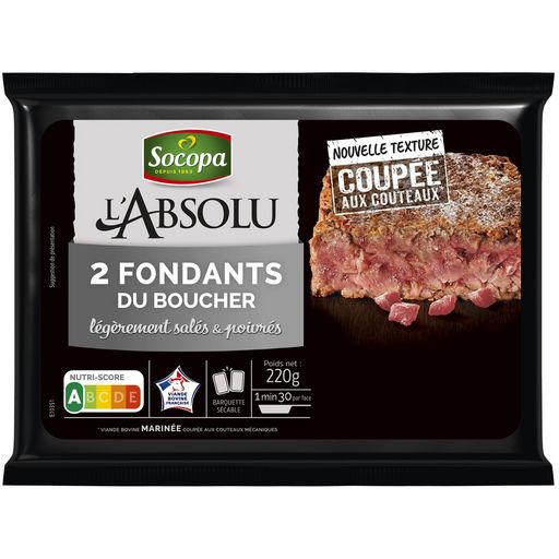 Une sélection rigoureuse de muscles maigres, 2 ou 3 étoiles Une viande marinée « à coeur » Une texture aux couteaux fondante : intermédiaire entre un piécé et un haché Un conditionnement en film noir, pour un rendu qualitatif Préparation de viande bovine coupée aux couteaux mécaniques, marinée