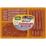 Ingrédients : Côte de porc marinée saveur mexicaine : côte de porc* 92%, épices, plantes aromatiques, sel, dextrose, acidifiants : E262, E330, E331, semoule de riz, sucre, fibres végétales (bambou, citron, citron vert, pomme de terre), antioxydants : E300, E301, poivron, huile de tournesol, arômes. Merguez : viande bovine* 65%, eau, gras de bovin*, viande de mouton** 5%, acidifiants : E326, E262, E263, sirop de glucose, sel, épices, dextrose, arômes naturels, antioxydants : E300, E301, plante aromatique, colorant : E162. Chipolatas : viande de porc* 85%, eau, gras de porc*, acidifiants : E326, E262, E263, sel, dextrose, antioxydant : E301, plante aromatique, arômes naturels, colorants : E162, E100. Boyau naturel de mouton. *Origine France. **Origine UE ou hors UE.