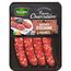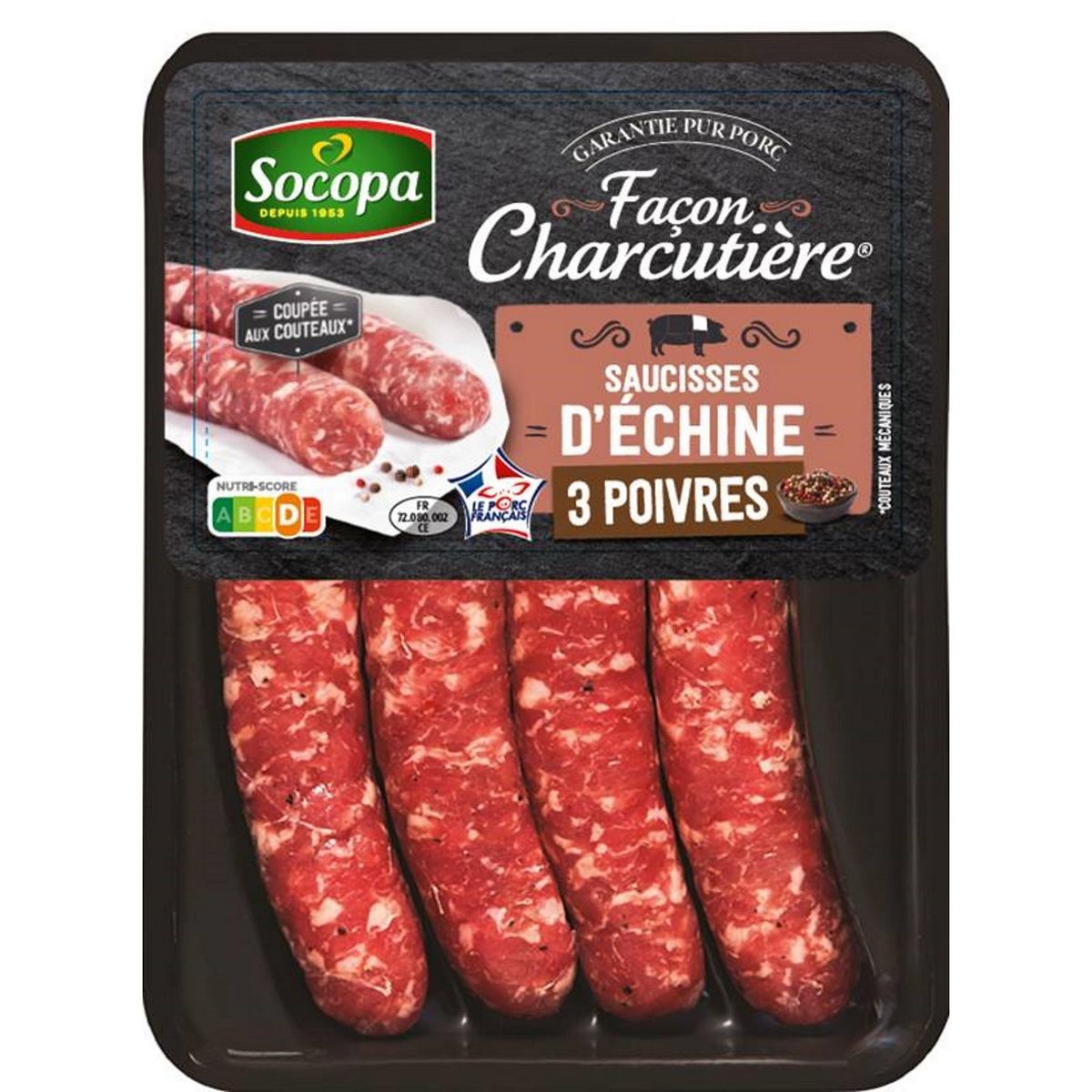 Ingrédients : Echine de porc* 87%, eau, sel, sirop de glucose, dextrose, épices (dont 3 poivres 0.5% : blanc, noir, vert) acidifiant ; acétates de sodium, plantes aromatiques, sirop de sucre caramélisé (sirop de glucose, sucre, maltodextrine), antioxydant : ascorbate de sodium, colorant : rouge de betterave, arômes naturels. *Origine France. Boyau naturel de mouton