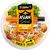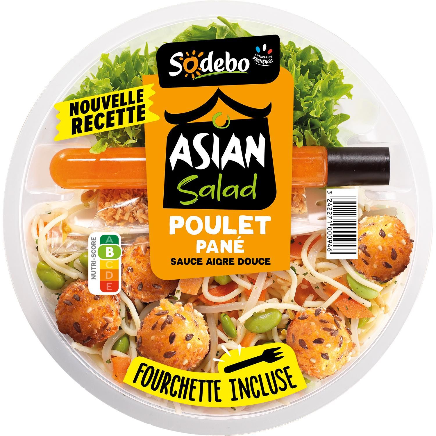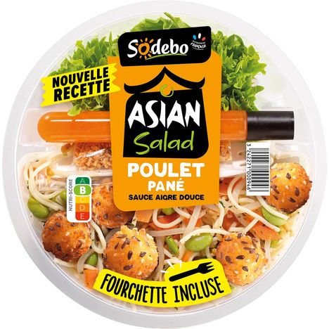 Salade composée garnie de pâtes fraiches cuites (35%), de bouchées panées (14%) à la viande de poulet (5%), de carottes (12%), de fèves de soja (9%), de germes de haricot mungo (7%), accompagnée d’une sauce (9%) aigre douce et d’un sachet (2%) d’oignons frits.