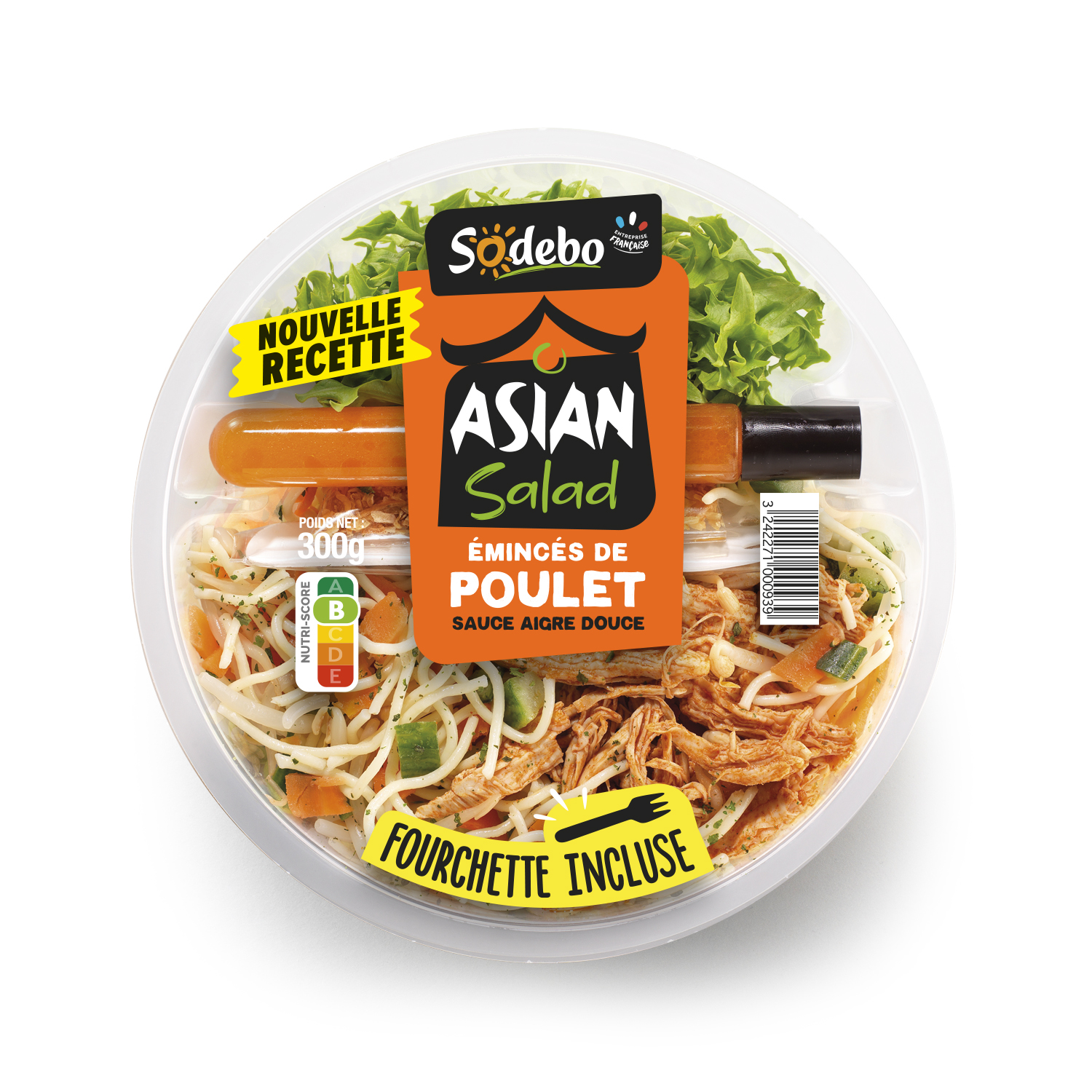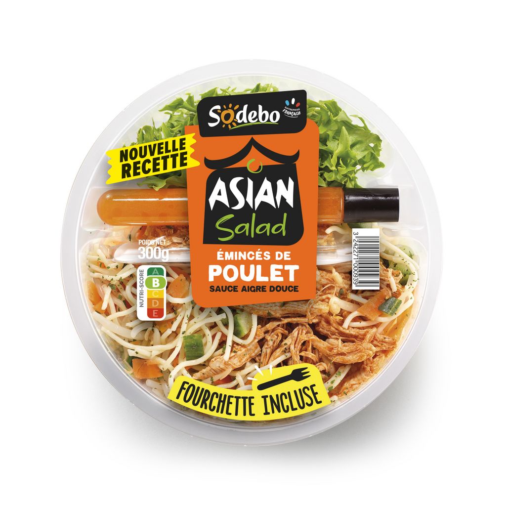 Salade composée garnie de pâtes fraiches cuites (35%), de poulet traité en salaison au curry rouge (14%), de carottes (12%), de concombre (9%), de germes de haricot mungo (7%), accompagnée d'une sauce (8%) aigre douce et d’un sachet (2%) d’oignons frits.