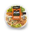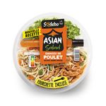 Ingrédients : Pâtes fraîches cuites (eau, semoule de BLE dur, OEUF, sel), viande de poulet, carotte, concombre, salade, germes de haricot mungo, eau, huiles végétales (colza, tournesol), oignon, poivron, citron, tomate, amidon et/ou fécule, vinaigre de riz, sucre, sirop de glucose, ferment, antioxydant: acide ascorbique, conservateur: vinaigre tamponné, sel, arômes naturels, épices, plantes aromatiques.