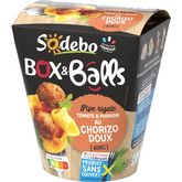 46% de pâtes fraîches cuites agrémentées de 12% de purée de tomates, 6% de poivrons, 8% de porc et 1,8% de chorizo La nouvelle BOX grand format ultra-généreuse aux inspirations d’ailleurs. Cette nouvelle Box synonyme de générosité et originalité grâce à sa protéine sous forme de boulette valorisée au chorizo, tomates et poivrons et sa nouvelle forme de pâte « Pipe Regate »!