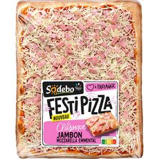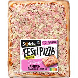 Pâte fine à pizza (51%) garnie de jambon cuit standard (14%) de mozzarella (12%), et d'emmental (2%)
