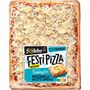 Pâte fine à pizza (52%) garnie de mozzarella (12%), de fromage à raclette (8%), de fromage à pâte pressée cuite (3%) et d'emmental (2%).