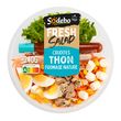 Ingrédients : Carotte, OEUF, salades, THON, FROMAGE, maïs, eau, huile de colza, sucre, purée de tomates double concentré, huile d'olive vierge, zeste de citron, vinaigre de vin (SULFITES), vinaigre d'alcool, jus de citron, moût de raisin, sucre, ferment, fibres végétales, amidon transformé de maïs, antioxydant: acide ascorbique, sel, persil.