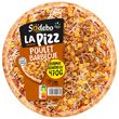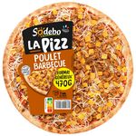 Pâte fine à pizza (40%) garnie de poulet rôti traité en salaison assaisonné barbecue (20%), d'emmental (12%) et de cheddar fondu (4%).
