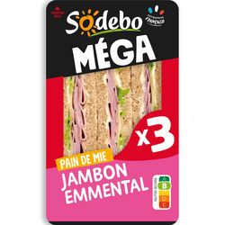 Sandwich au pain de mie (56%) garni de jambon cuit standard (13%) et d’emmental (9%).