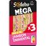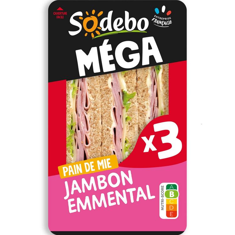 Ingrédients : Pain de mie (farines de BLE, de BLE complète, de fèves et d'ORGE malté, eau, huile de colza, levure boulangère, sucre, sel, gluten de BLE, vinaigre d’alcool), jambon de porc, EMMENTAL, huile de colza, eau, salade, jaune d'OEUF, vinaigre d'alcool, amidon et/ou fécule, dextrose, sirop de glucose, ferment, conservateur : nitrite de sodium, stabilisant : triphosphates, antioxydant : érythorbate de sodium, sel, arômes naturels, bouillon de porc, poivre, graines de MOUTARDE.