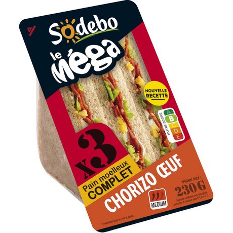Le premier Club Sandwich au Chorizo du marché, sans additif, pour mettre un peu de piquant dans une gamme déjà gourmande! Sandwich composé de 56% de pain de mie complet garni de 11% de chorizo cuit et de 11% d’oeuf.