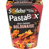 Ingrédients : Pâtes fraîches cuites (eau, semoule de BLE dur 20%, OEUF, sel), viande de boeuf, purée de tomates, eau, purée de tomates double concentré, oignons, carottes 2%, huile de colza et/ou tournesol, amidon et/ou fécule, conservateurs : sorbate de potassium, acétate de sodium, sel, arôme naturel, poivre, romarin, laurier.