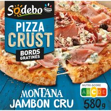 Ingrédients : Pâte moelleuse à pizza (farines de BLE et de BLE malté, eau, levain de germe de BLE, levure boulangère, sel), purée de tomates, MOZZARELLA, eau, FOURME D'AMBERT AOP, poitrine de porc, viande de porc, CREME légère 3%, oignons 2%, RICOTTA, olives noires avec noyau, huile de colza et/ou tournesol, farine de BLE, amidon et/ou fécule, LACTOSE, dextrose, sirop de glucose, conservateurs : vinaigre tamponné, nitrite de sodium, antioxydants : érythorbate de sodium, ascorbate de sodium, sel, arôme naturel, arôme de fumée, épices, plantes aromatiques.