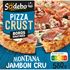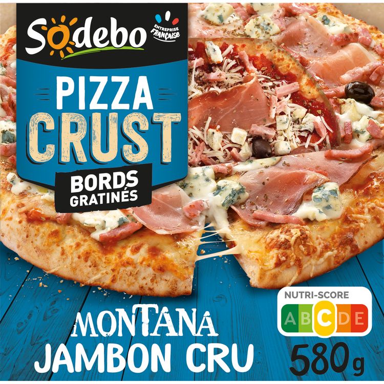 Pâte moelleuse à pizza (40%) garnie de mozzarella râpée (12%), de lardons cuits fumés (6%), de dés de fourme d'Ambert AOP (5%) et de jambon cru fumé (3%).