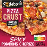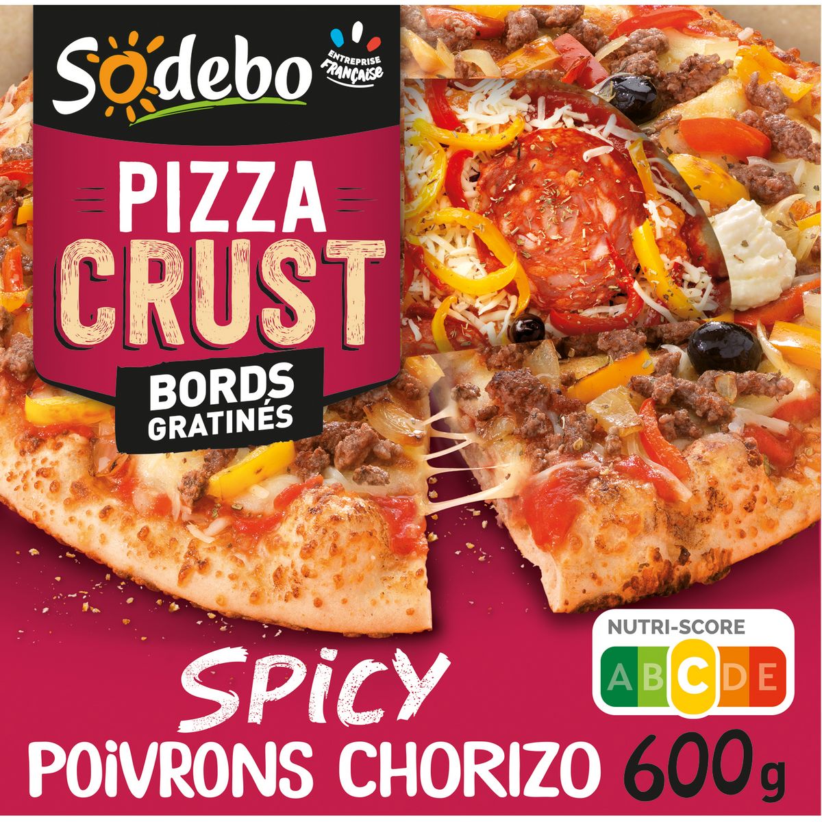 Pâte moelleuse à pizza (40%) garnie de poivrons grillés (7%) et de chorizo (6%).