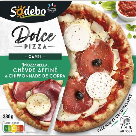 Pâte fine à pizza (43%) garnie de mozzarella (19%), de fromage de chèvre (7%) et de coppa (7%).