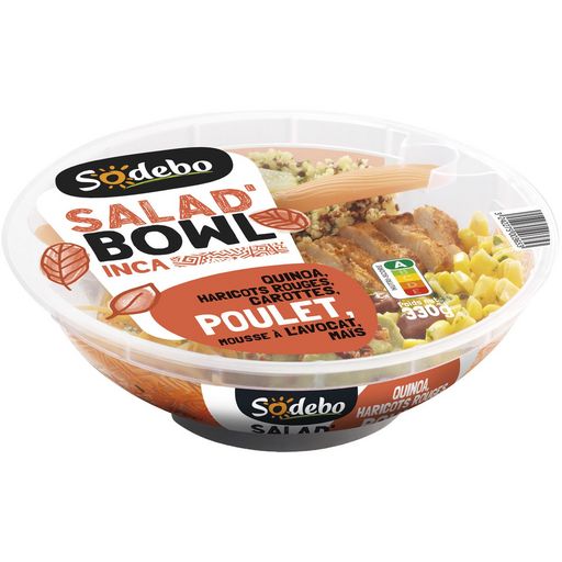 Ingrédients : Quinoa cuit (eau, QUINOA, sel), carottes, boulgour cuit (eau, BLE dur concassé, sel), viande de poulet, eau, maïs doux,quartier de citron, haricots rouges secs, petits pois 5%, poivrons, tomates, avocats 2%, raisins secs, oignons, purée etjus de citron, lait de coco, huile d'olive vierge, huiles végétales (colza, tournesol et coton), vinaigre d'alcool, dextrose deblé, sirop de glucose de blé , sucre, fécule de manioc, antioxydant: acide ascorbique, correcteur d'acidité: acide citrique,sel, arômes naturels, plantes aromatiques, épices.Cette salade peut contenir des traces d'oeuf, de soja, de sésame, de moutarde et de lait.Informations en MAJUSCULES destinées aux personnes allergiques.Poulet : Origine UE