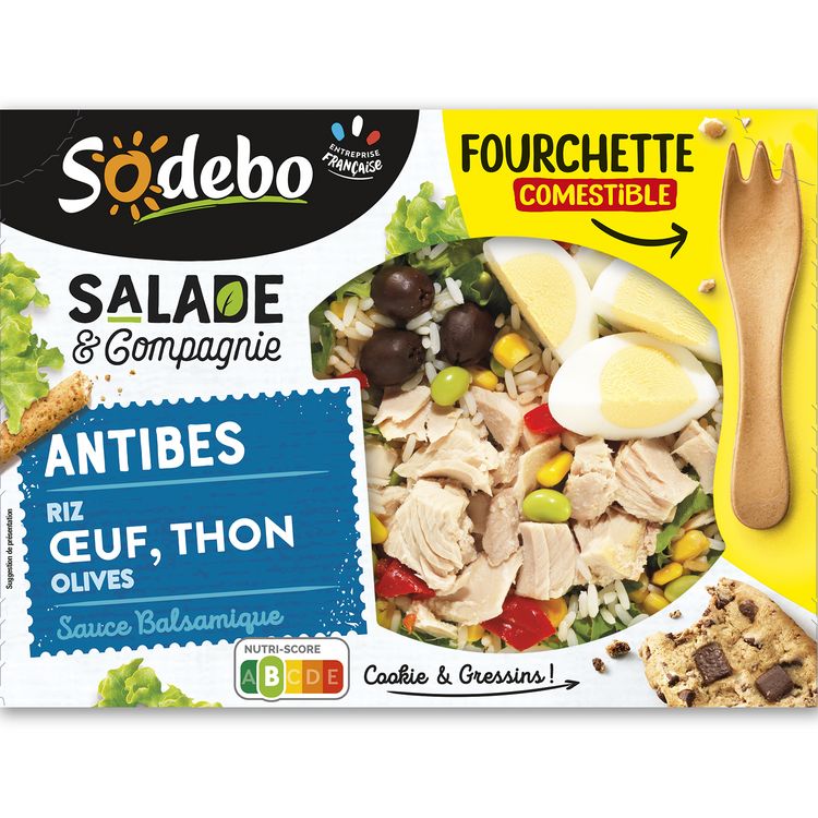 Salade composée préparée avec du riz cuit (30%), de l'œuf (14%), du thon (6%) et des olives (2%), accompagnée d'une sauce vinaigrette avec du vinaigre balsamique (2%), d'un cookie avec des morceaux de chocolat (2%), de gressins et d'une fourchette à la farine de blé (0,9%)