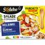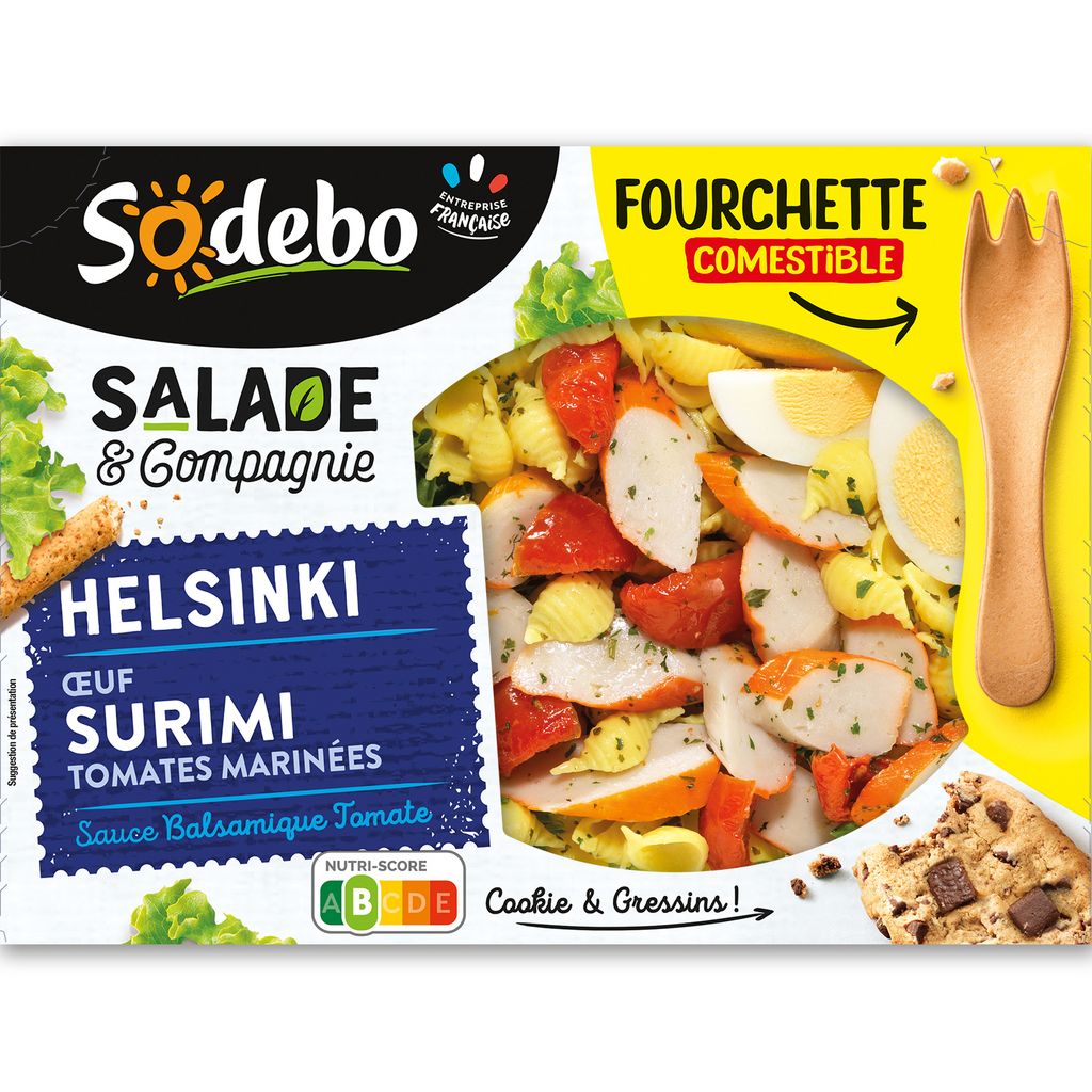 Salade composée préparée avec des spécialités céréalières cuites (36%), de l'oeuf (14%), du surimi (10%), des tomates marinées (5%), accompagnée d'une sauce vinaigrette avec du vinaigre balsamique (1%) et de la purée de tomates double concentré (0,6%), d'un cookie avec des morceaux de chocolat (2%), de gressins et d'une fourchette à la farine de blé (0,9%)