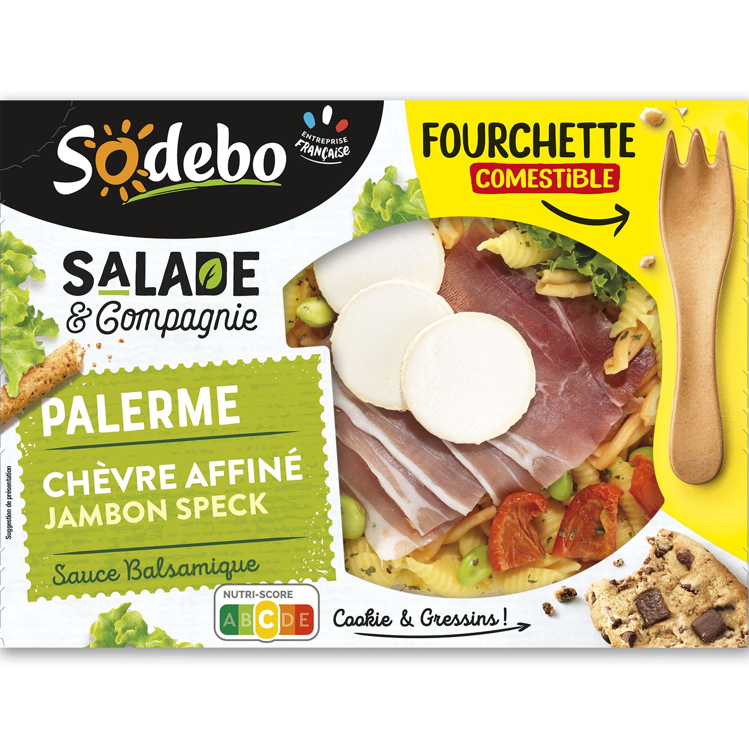 Salade composée préparée avec des spécialités céréalières cuites (45%), du fromage de chèvre (6%) et du jambon speck (5%) accompagnée d'une sauce vinaigrette avec du vinaigre balsamique (2%), d'un cookie avec des morceaux de chocolat (2%), de gressins et d'une fourchette à la farine de blé (0.9%)