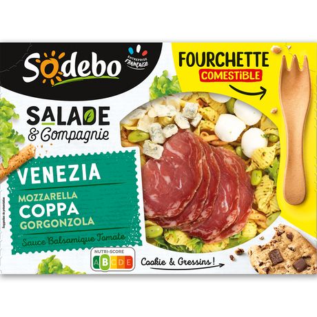 Salade composée préparée avec des spécialités céréalières cuites (44%), de la mozzarella (7%), de la coppa (5%) et du gorgonzola (5%), accompagnée d'une sauce vinaigrette avec du vinaigre balsamique (1%) et de la purée de tomates double concentré (0,6%), d'un cookie avec des morceaux de chocolat (2%), de gressins et d'une fourchette à la farine de blé (0,9%).