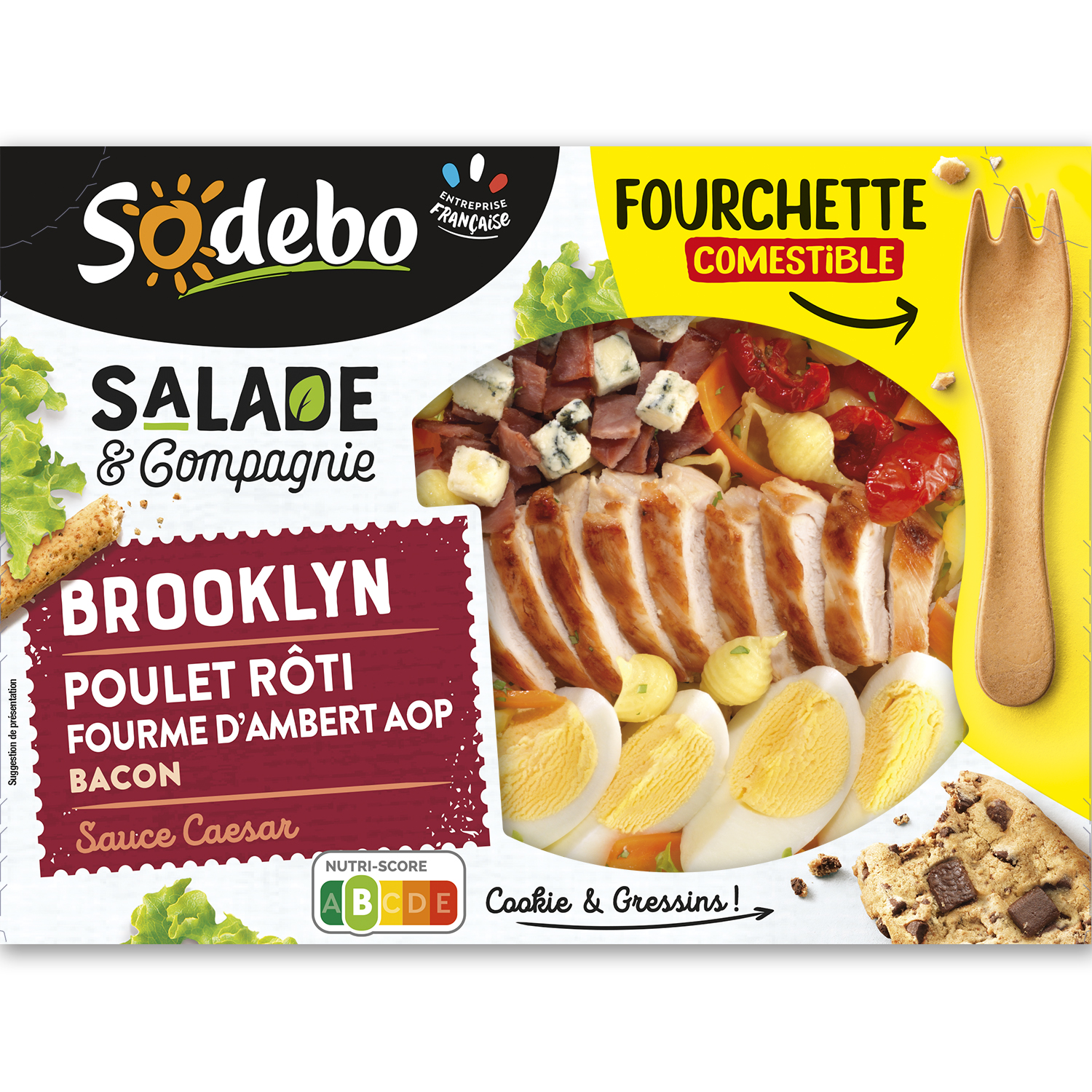 Salade composée préparée avec des spécialités céréalières cuites (24%), du poulet rôti traité en salaison (11%), de la fourme d'Ambert AOP (4%) et du bacon fumé grillé (1%) accompagnée d’une sauce Caesar (7%), d’un cookie avec des morceaux de chocolat (2%), de gressins et d'une fourchette à la farine de blé (0,9%)
