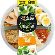Salade composée préparée avec de la salade (22%), du poulet rôti traité en salaison (15%), des tomates mi-séchées (7%), accompagnée d'une sauce Caesar (10%)