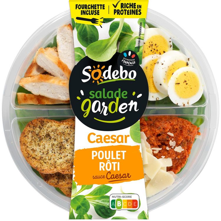 Ingrédients : Salade, OEUF, viande de poulet, tomates mi-séchées, purée de tomate, eau, huile de colza, FROMAGE 5%, farines de BLE et de BLE malté, PARMESAN 0,9%, jaune d'OEUF, jus de citron, oignon, huile d'olive vierge, vinaigre d’alcool, farines de fèves et d'ORGE malté, gluten de BLE, amidon et/ou fécule, levure, levain de BLE dur, sucre, dextrose, sel, arôme naturel, plantes aromatiques, ail, graines de MOUTARDE, acérola, poivre.