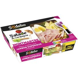 Ingrédients : Salade composée 82% : Conchiglie et fusilli cuits (eau, semoule de BLE dur, OEUF, sel, épices), OEUF, salade 12%, jambon de porc, tomates 7%, EMMENTAL, jus de citron, huile de colza, eau, LACTOSE, dextrose, ferments, conservateur: E250, antioxydant : E316, sel, arôme naturel.Cette salade peut contenir des traces de SOJA.Sauce vinaigrette balsamique 8% : huile de colza, huile d'olive vierge, vinaigre de vin (SULFITS), moût de raisin, sel.Cookie 5% : farine de BLE, OEUF, BEURRE concentré, huile de colza, sucre, eau, pâte de cacao, poudre de cacao maigre, beurre de cacao, amidon de BLE, poudres à lever : E450, carbonates de sodium , émulsifiant: lécithine de tournesol, arôme vanille, sel.Gressins 5% : farine de BLE, eau, huile d'olive vierge, romarin, levure boulangère, sel, graines de pavot, semoule de BLE dur, sucre.Informations en MAJUSCULE destinées aux personnes allergiques.Porc : Origine UE