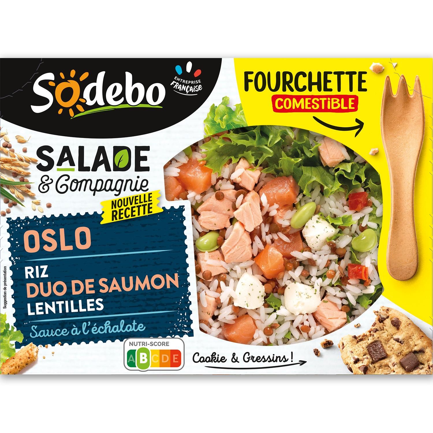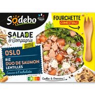 Salade composée préparée avec du riz cuit (35%), des lentilles brunes cuites (6%), du saumon cuit (5%) et du saumon fumé (3%), accompagnée d'une sauce vinaigrette à l'échalote (0,2%), d'un cookie avec des morceaux de chocolat (2%), de gressins et d'une fourchette à la farine de blé (0,9%).