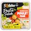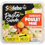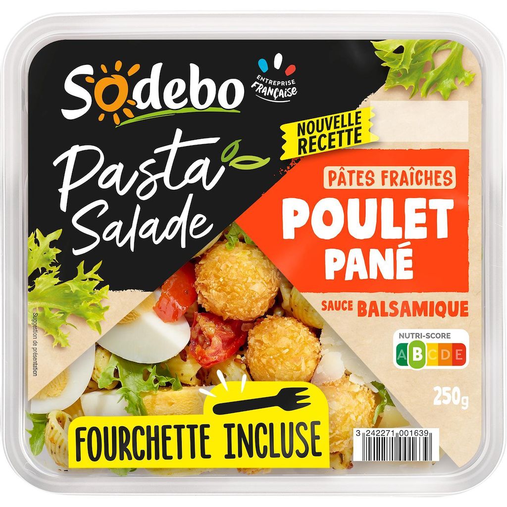 Salade composée préparée avec des pâtes fraîches cuites (33%), de l'œuf (18%), du poulet traité en salaison pané (16%) et des tomates marinées (4%) accompagnée d'une sauce (9%) avec du vinaigre balsamique (3%).